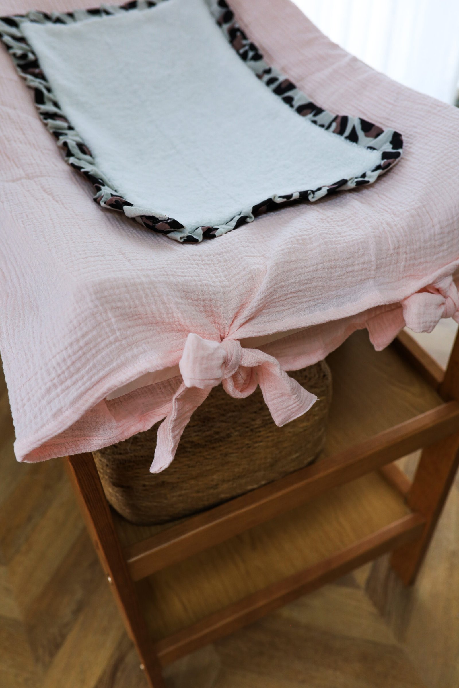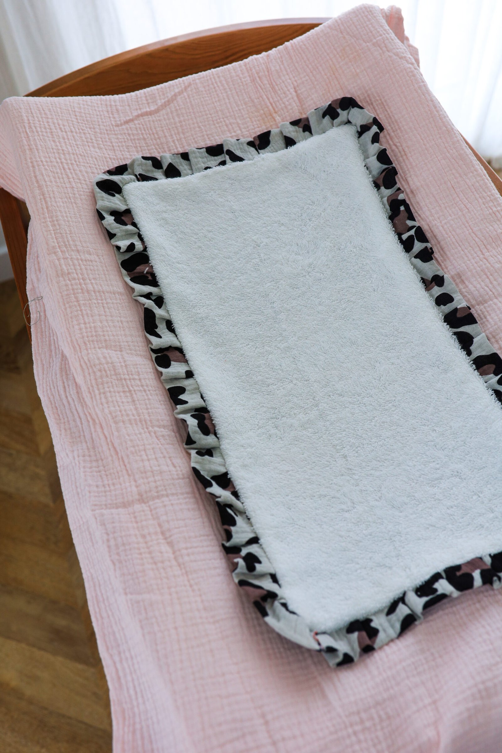 Housse matelas à langer froufrou rose/ léopard